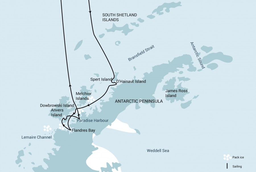 PLEASE NOTE: All itineraries are for guidance only. Programs may vary depending on ice, weather, and wildlife conditions. Landings are subject to site availabilities, permissions, and environmental concerns per IAATO regulations. Official sailing plans and landing slots are scheduled with IAATO prior to the start of the season, but the expedition leader determines the final plan. Flexibility is paramount for expedition cruises.